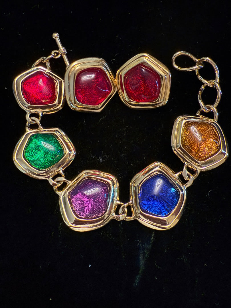 Cabochon "My Sales Rock" bracelet earring set. Beautiful Gold toned set with jewel tones red blue purple Green and yellow. This eye catching set was designed for Avon sellers and this one is in like new condition! Stunning set!