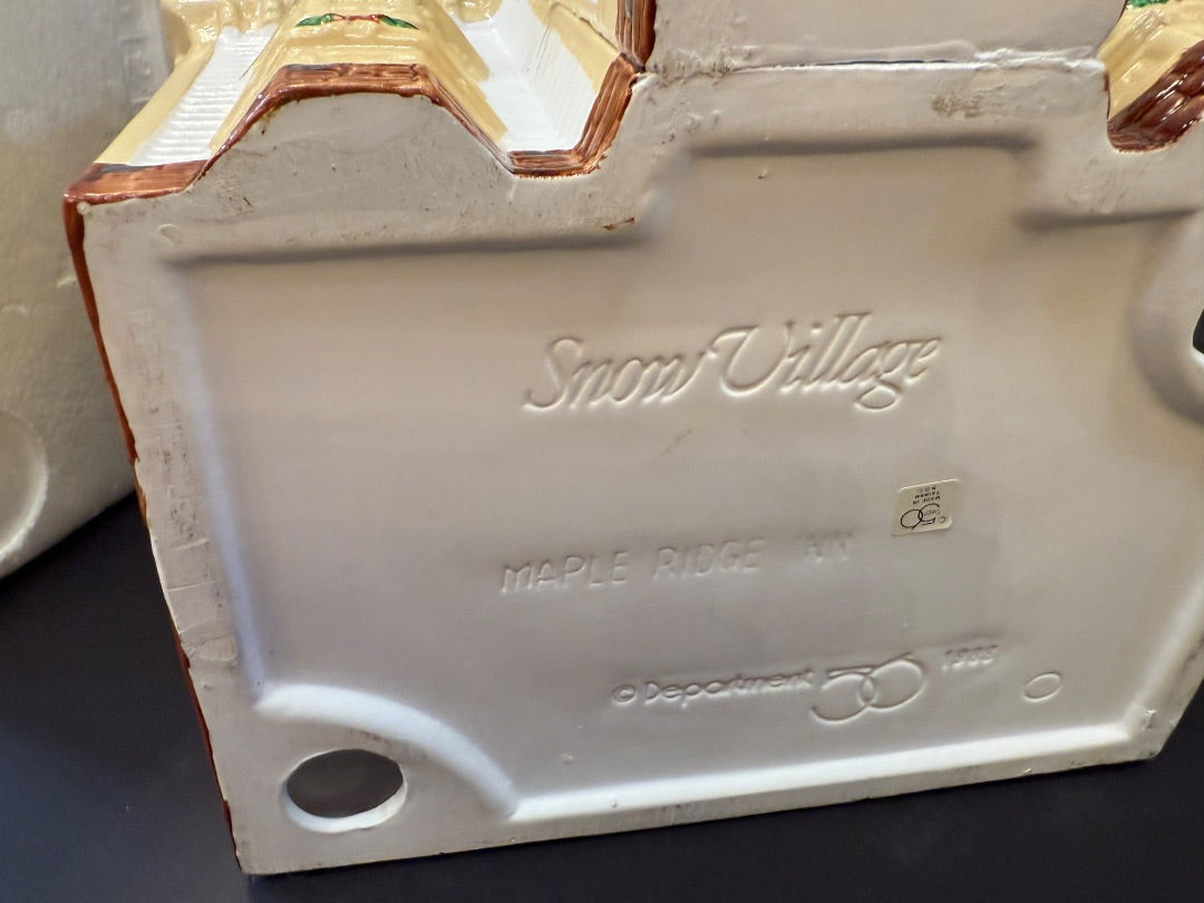 The product is a Department 56 Snow Village Maple Ridge Inn #51217 from 1988, a Christmas Village collectible in an asymmetrical shape. This retired piece was manufactured in the 1980s as part of the Snow Village collection, making it a sought-after item for collectors of holiday and seasonal decor. The inclusion of its original box adds to its appeal and value as a timeless piece of Christmas village memorabilia.