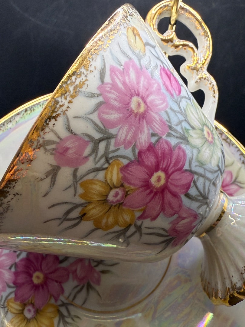 October Lusterware pink Flower teacup saucer